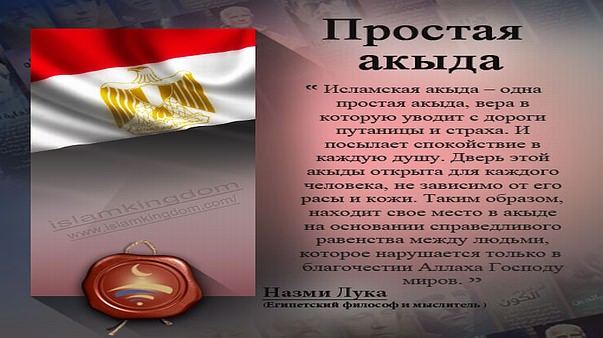 «Исламская акыда – одна простая акыда, вера в которую уводит с дороги путаницы и страха. И посылает спокойствие в каждую душу. Дверь этой акыды открыта для каждого человека, не зависимо от его расы и кожи. Таким образом, находит свое место в акыде на основании справедливого равенства между людьми, которое нарушается только в благочестии Аллаха Господу миров».