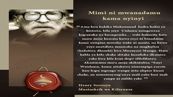 “Ama kwa hakika Muhammad haiba halisi ya historia, bila yeye Uislamu usingeweza kupanuka na kuongezeka… wala hakusita hata mara moja kusema kuwa yeye ni binadamu kama wengine mwisho wake ni mauti, na kuwa yeye anatafuta msamaha na maghufira (kufutiwa dhambi) kwa Mwenyezi Mungu. Hata kabla ya kifo chake alitaka kusafisha dhamira yake kwa kila kosa dogo alilolifanya. Akasimama mara moja akihutubia: “Enyi Waislamu, kama nitakuwa nimempiga yeyote huu hapa mgongo wangu mtu alipize kisasi chake, au nimemnyang’anya mali yake basi mali yangu ni miliki yake.”